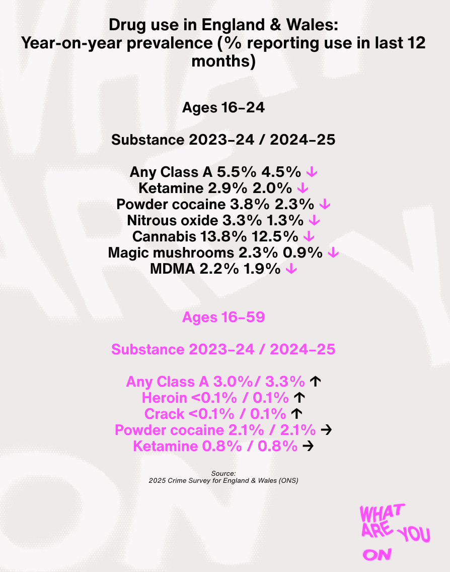 That’s the overall trend, but there might be individual drugs that buck within that – we previously saw a rapid rise in last-year cocaine use amongst older and younger users, for instance. But powder cocaine seems to have reduced, and MDMA continues to fall out of fashion.